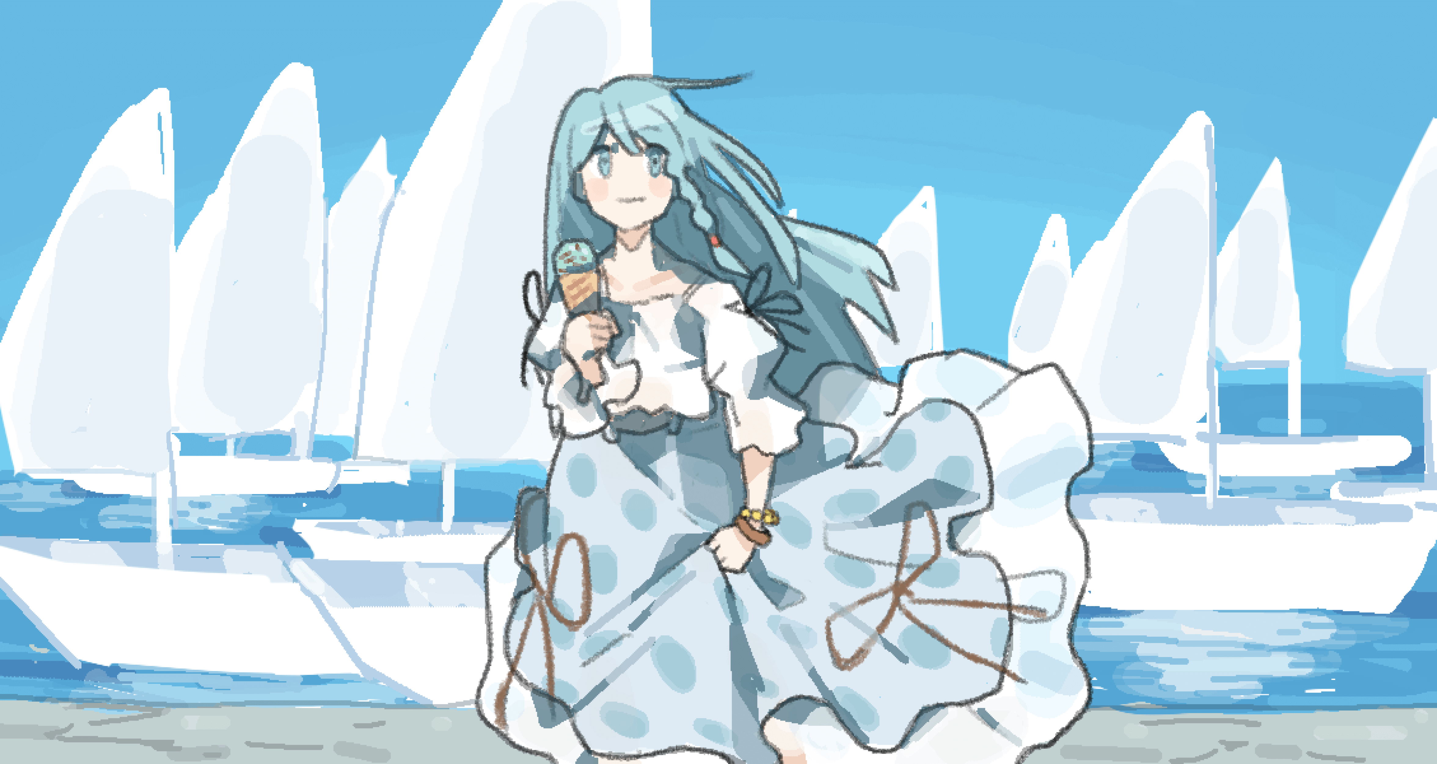 同名の曲を聴きながらイメージして描いたもの。潮風に揺られながらふわふわと港町を歩く不思議な女の子。まるで潮風をそのまま人の形にしたみたいな子 ミントブルーガール(歌詞ガン無視)